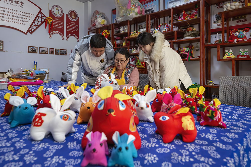 2023、01、26,枣庄市非遗传承人王欣,向放假回乡的大学生传授非遗布艺制作技艺,用文化传承的方式同贺卯兔新年。