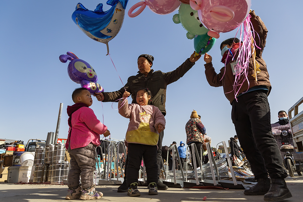 2023、01、20(腊月二十九)拍摄于枣庄市齐村大集。一位父亲带着儿女选购气球,孩子们笑逐颜开,喜迎兔年春节,画面温馨有趣。