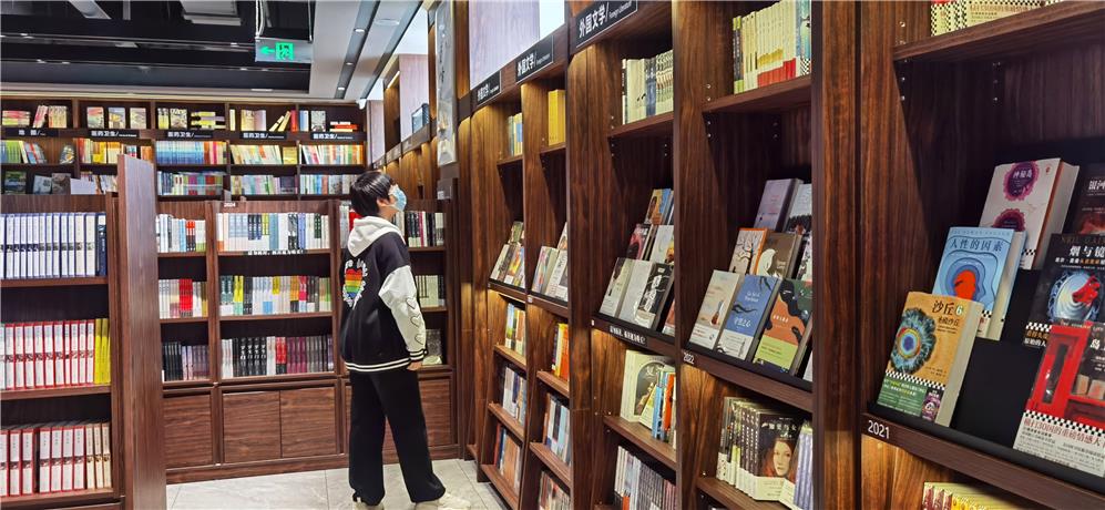 4月9日星期天,一名学生正在曹县新华书店浏览书籍。