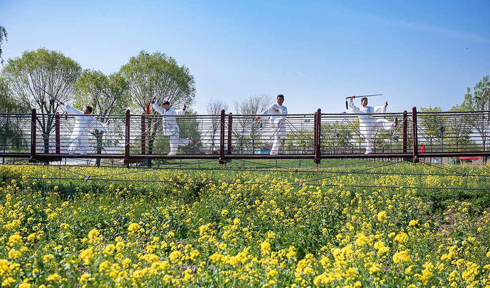2023年4月8日,济宁市兖州区,锻炼太极剑的人。