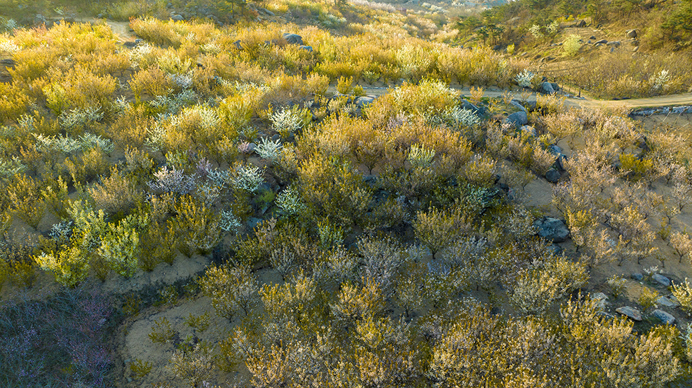 2023年4月2日,山东文登昆嵛山开满樱桃花的山岭小路