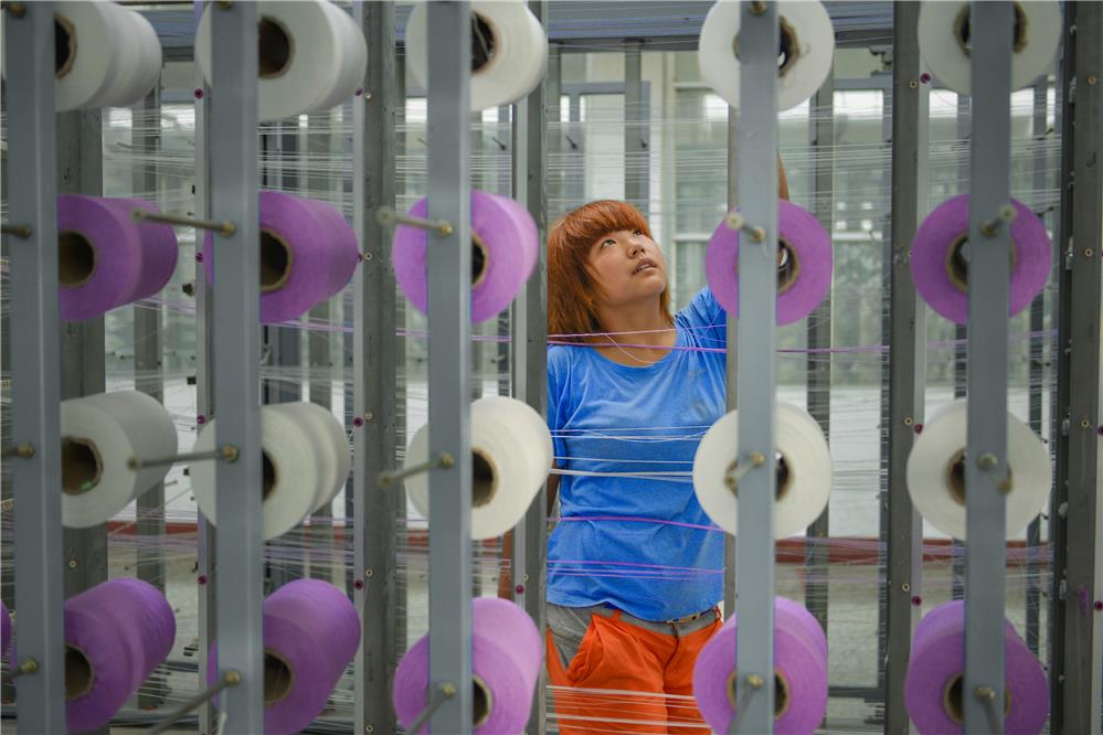 山东省孚日家纺的纺织女工在工作中。