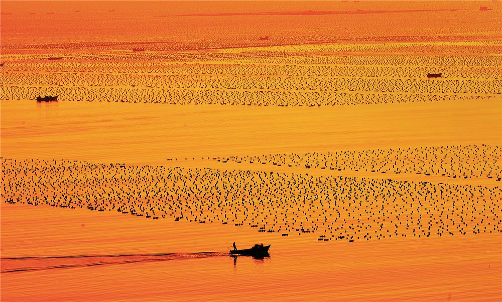 旭日东升,霞光满天,山东省荣成市烟墩角的渔民们映着朝霞架船出海劳作。
