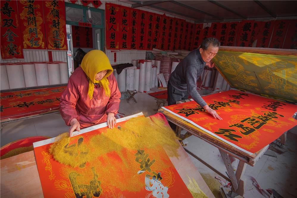 山东省高密市东李村是一个春联印刷专业村,老百姓凭借春联印刷走上了致富路。东李村的李善琦和老伴孙淑芬在春联第一次印刷成型的基础上,对再进行套印,使字体边缘增加烫金的颜色,然后再对印刷好的春联撒上一层金粉,使字体散发出点点金光。