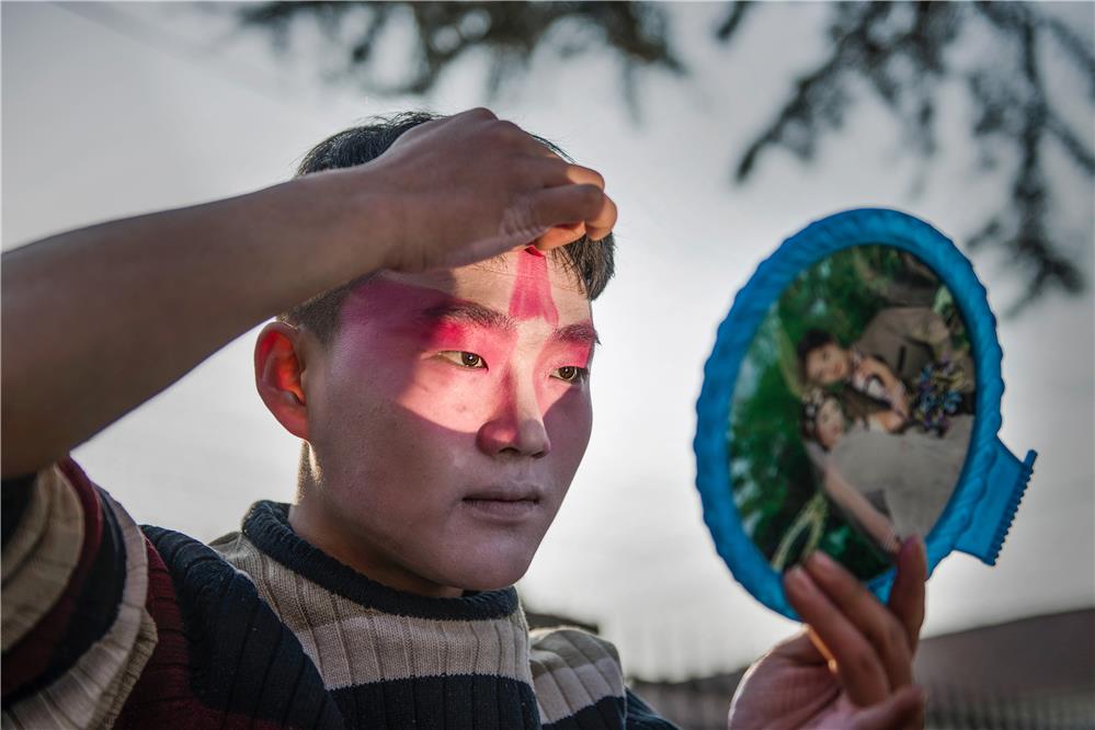 山东省的“高密茂腔”是国家级非遗文化项目,下乡演出时,演员张一兵上台前再补一下妆。