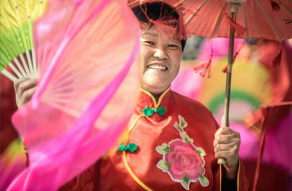 广场上大妈们在跳秧歌舞,开心又健康。