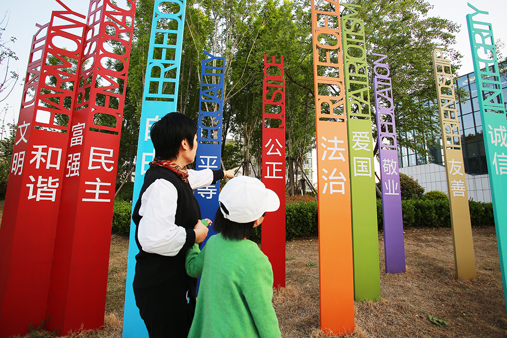 2023年四月一位母亲带着孩子来到大学校园感受校园文化。