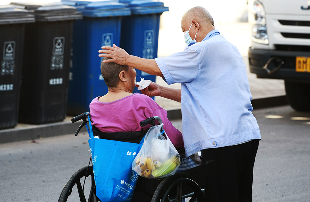 2022年9月,山东省邹平市街头一位市民正在为坐在轮椅上的老人擦拭呕吐物.
