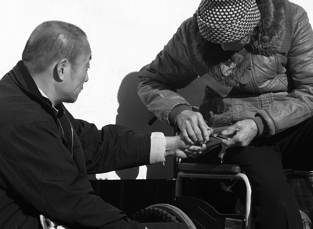 一位母亲正在为身患疾病生活不能自理的孩子剪指甲。